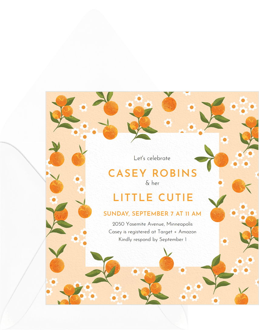 CALLIOPE A little Cutie Baby Shower Invitation Printable Orange Baby Shower Invite Citrus Baby Shower Invite Orange Blossom Baby Shower. Little Cutie Is On The Way Baby Shower Invitation Card Clementine Shower Invite Orange Baby Shower Unisex Baby Shower Invite Corjl BS032 DahliaPaperBoutique 932 382 765 50. Choose from twelve unique paper types two printing options and six shape options to design a card thats perfect.